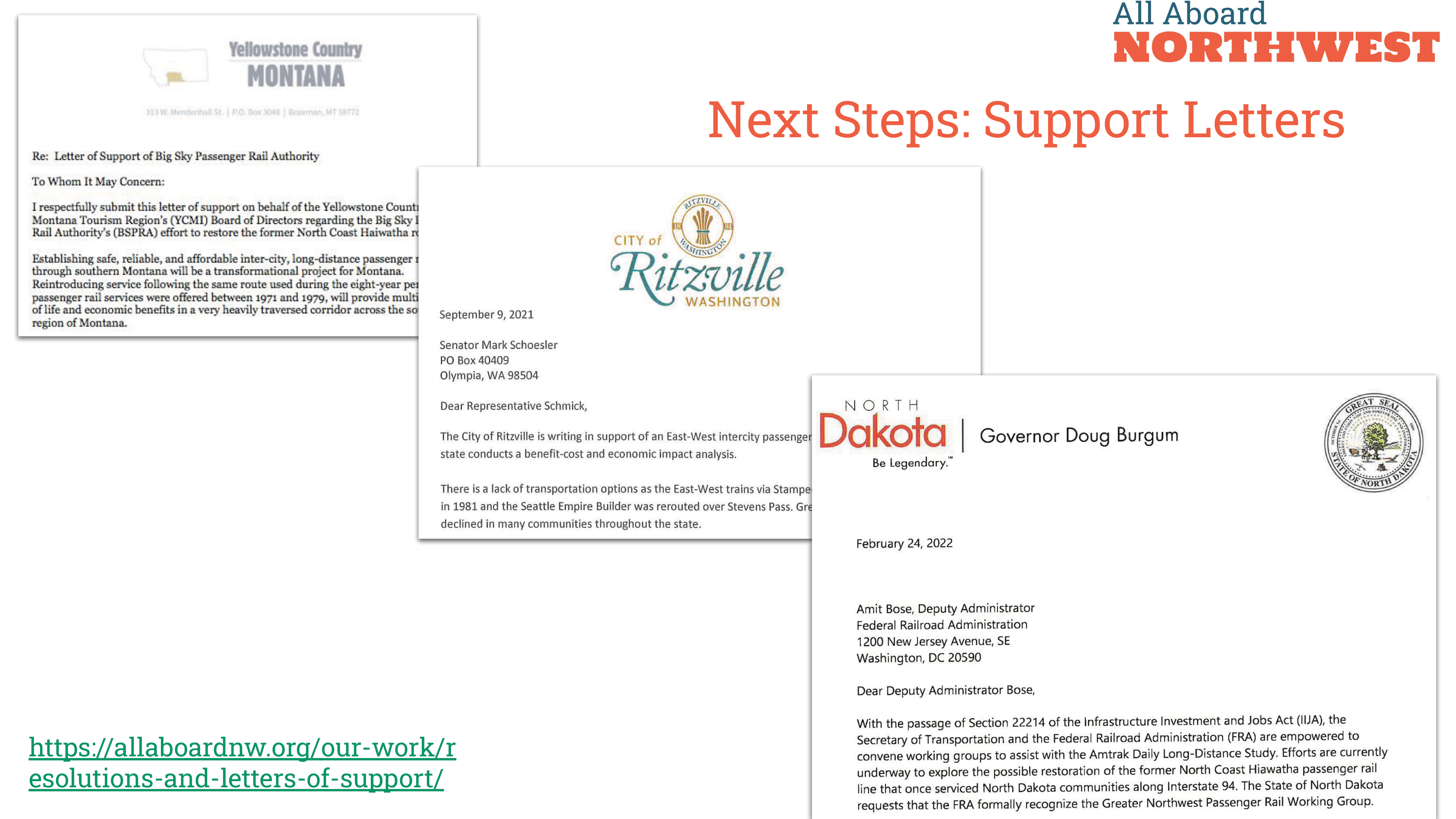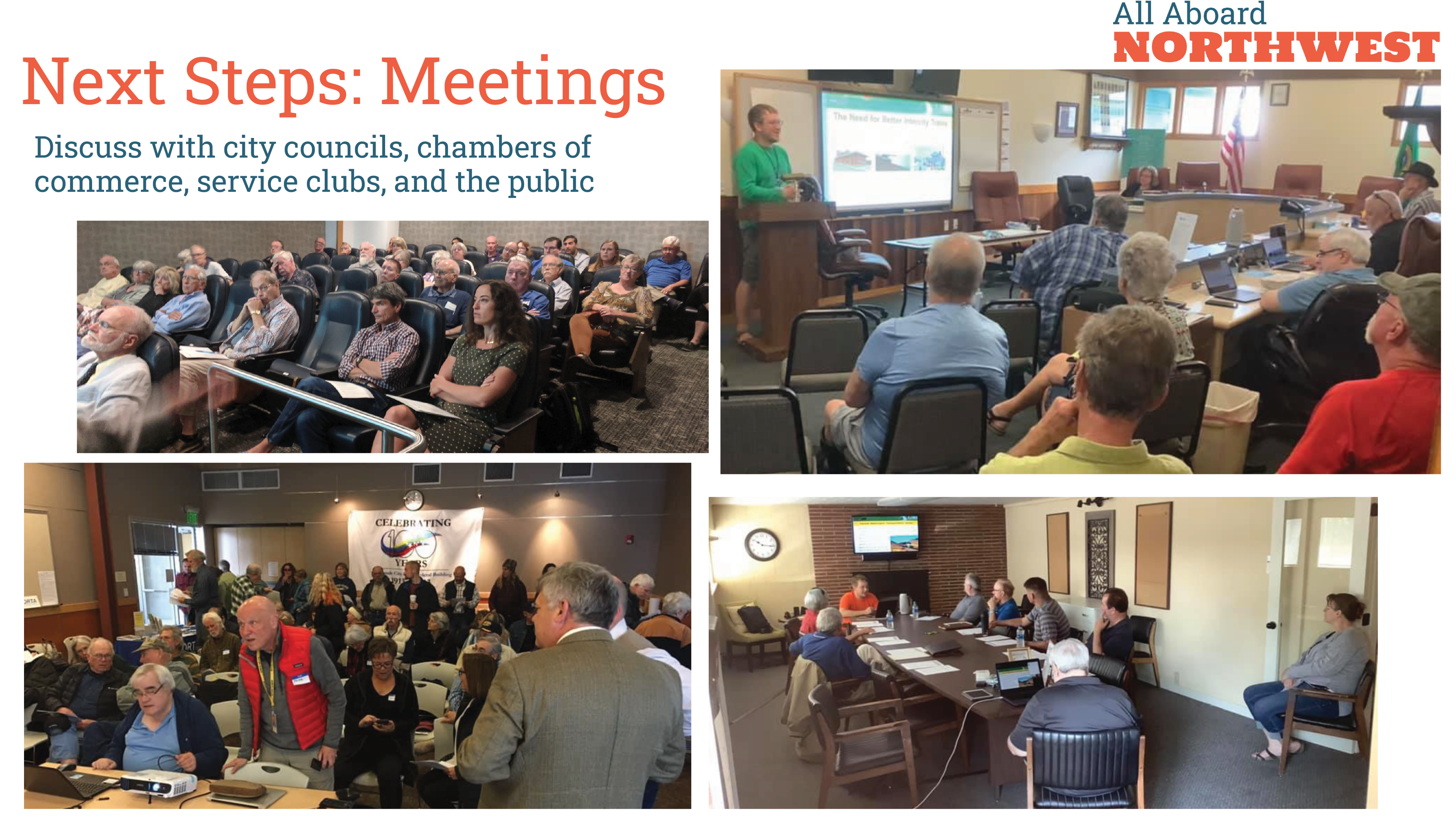 Communities can apply for competitive grants, but funding will require local and state government support. All Aboard Northwest can bring the discussion to your community. With your help, we can organize: